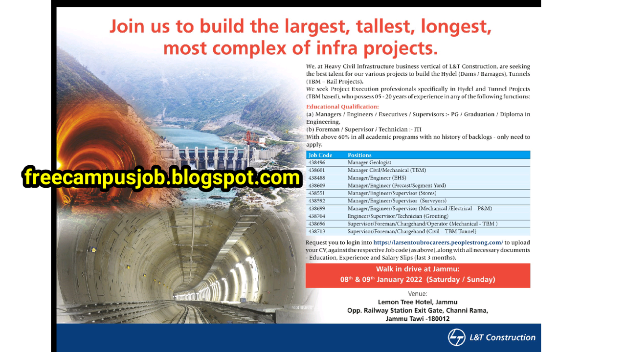 Civil Infrastructure business vertical of L & T Construction , are seeking the best lent for our various projeus to build the Hyde ( Dams / Barrages ) , Tunnels IBM Rail Projects ) . We sock Project Execution professionels specifically in Hydel and Tunnel Projects ( TIM based , who possess 05-20 years of experience many of the following functions.