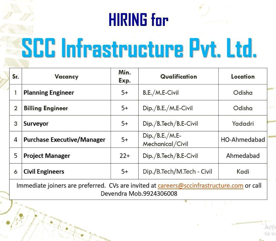 Immediate joiners are preferred. CVs are invited at careers@sccinfrastructure.com or call Devendra Mob.9924306008