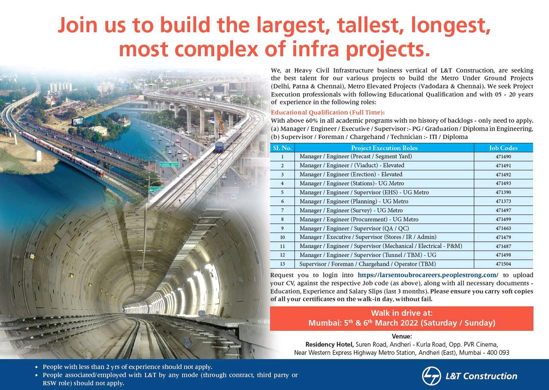 We, at Heavy Civil Infrastructure business vertical of L&T Construction, are seeking the best talent for our various projects to build the Metro Under Ground Projects (Delhi, Patna & Chennai), Metro Elevated Projects (Vadodara & Chennai). We seek Project Execution professionals with following Educational Qualification and with 05 20 years of experience in the following roles.