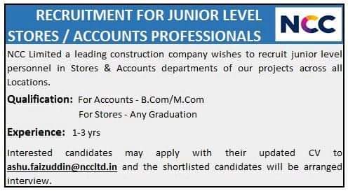 NCC Limited a leading construction company wishes to recruit junior level personnel in Stores & Accounts departments of our projects across all Locations .