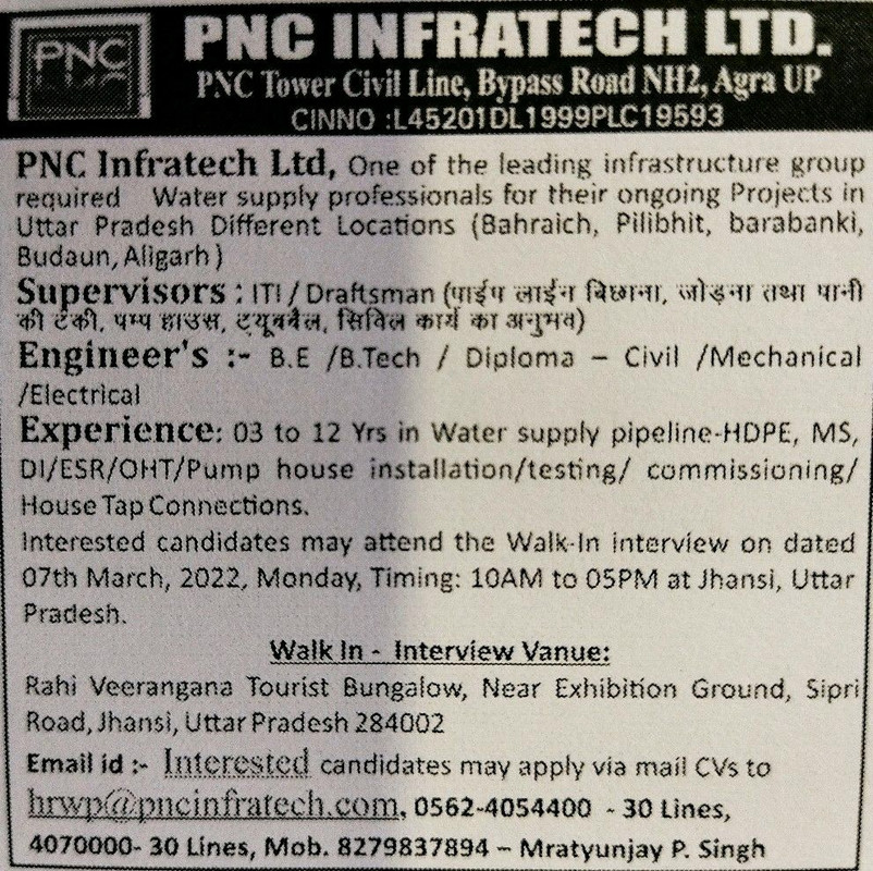 PNC Infratech Ltd. One of the leading infrastructure group required Water supply professionals for their ongoing Projects in Uttar Pradesh Different Locations (Bahraich, Pilibhit, barabanki, Budaun, Aligarh )