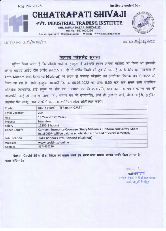 Venue :- Chhatrapati Shivaji Pvt. Industrial Training Institute , Adress- Ahi , Jamua, Bazar , Mirzapur