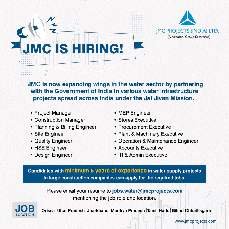JMC is now spending wings in the water sector by partnering with the Government of india in a various water Infrastructure projects spread across india the jal jivan mission .