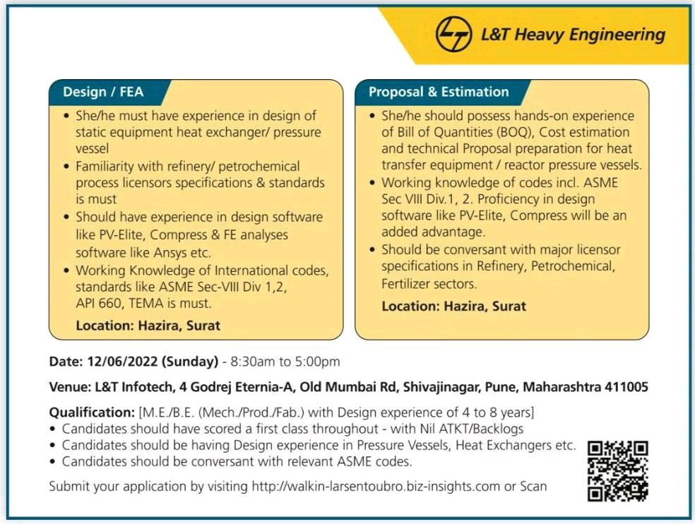 - Candidates should be having Design experience in Pressure Vessels , Heat Exchangers etc.