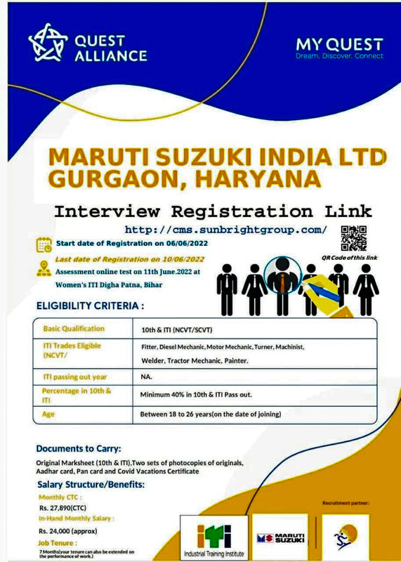 Required Documents :- Original Marksheet ( 10th & ITI ) . Two sets of photocopies of originals , Aadhar card , Pan card and Covid Vacations Certificate