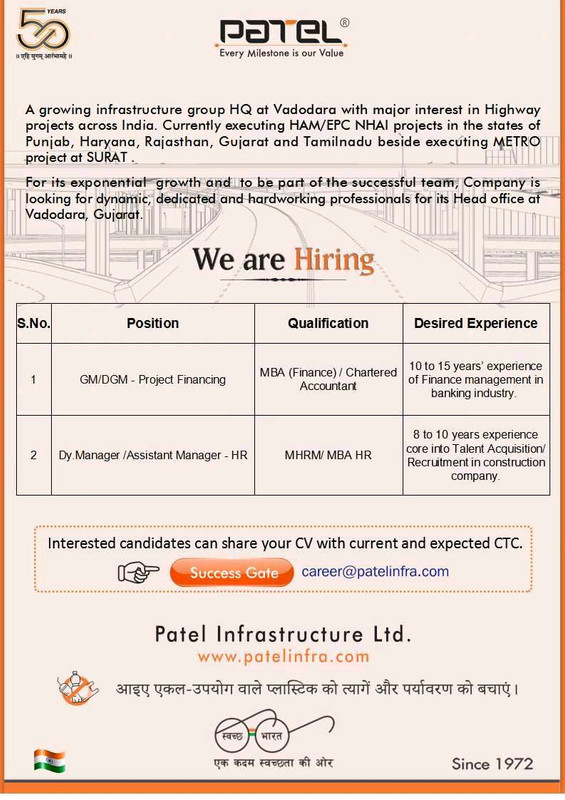 A growing infrastructure group HQ at Vadodara with major interest in Highway projects across India . Currently executing HAM / EPC NHAI projects in the states of Punjab , Haryana , Rajasthan , Gujarat and Tamilnadu beside executing METRO ng METRO project at SURAT . For its exponential growth and to be part of the successful team , Company is looking for dynamic , dedicated and hardworking professionals for its Head office at Vadodara , Gujarat .