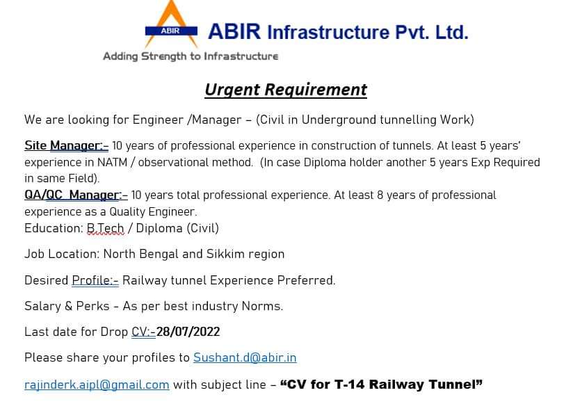 Last date for Drop CV :- 28/07/2022 Please share your profiles to Sushant.d@abir.in & rajinderk.aipl@gmail.com with subject line - " CV for T - 14 Railway Tunnel "