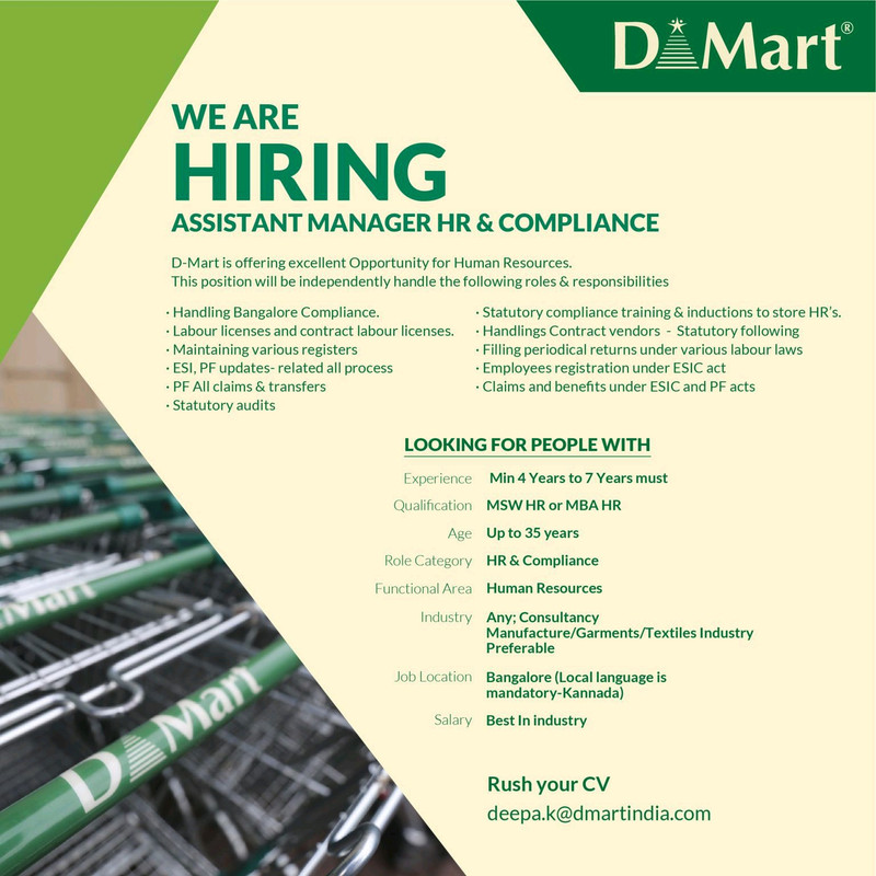 Interested Candidates Send Your CV : deepa.k@dmartindia.com