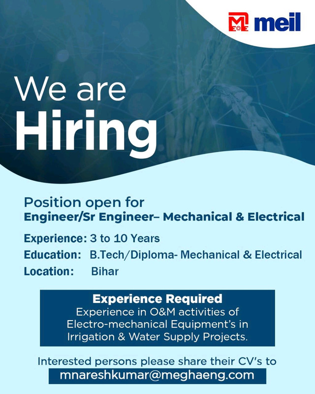 - Experience Required :- Experience in O & M activities of Electro - mechanical Equipment's in Irrigation & Water Supply Projects .