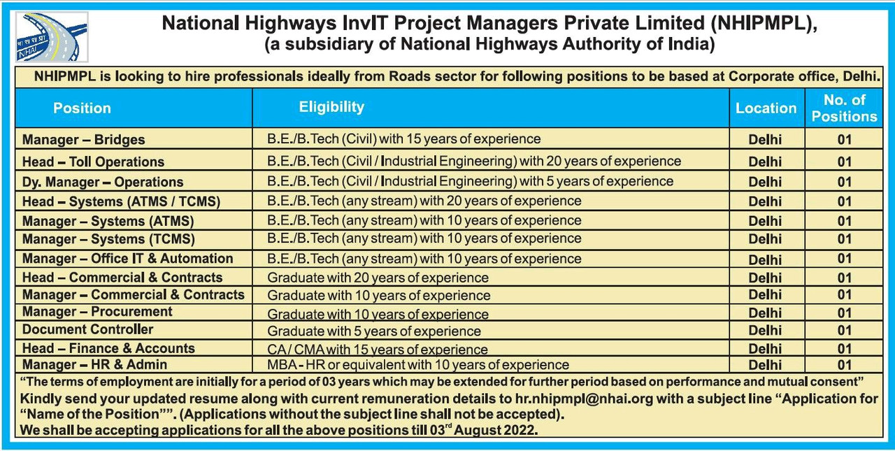 NHIPMPL is looking to hire professionals ideally from Roads sector for following positions to be based at Corporate office , Delhi