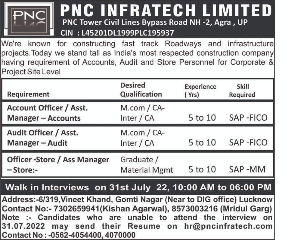 We're known for constructing fast track Roadways and infrastructure projects . Today we stand tall as India's most respected construction company having requirement of Accounts , Audit and Store Personnel for Corporate & Project Site Level