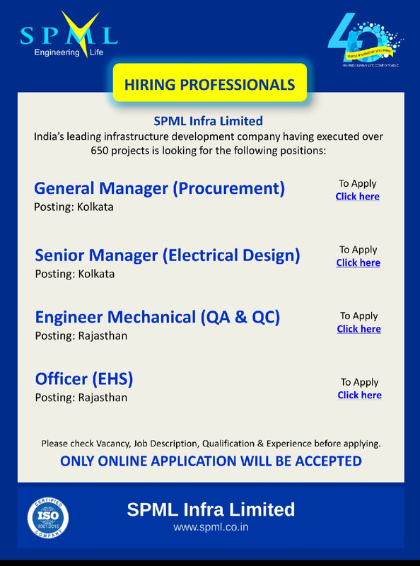 SPML Infra Ltd India's leading infrastructure development company having executed over 650 projects is looking for the following positions :