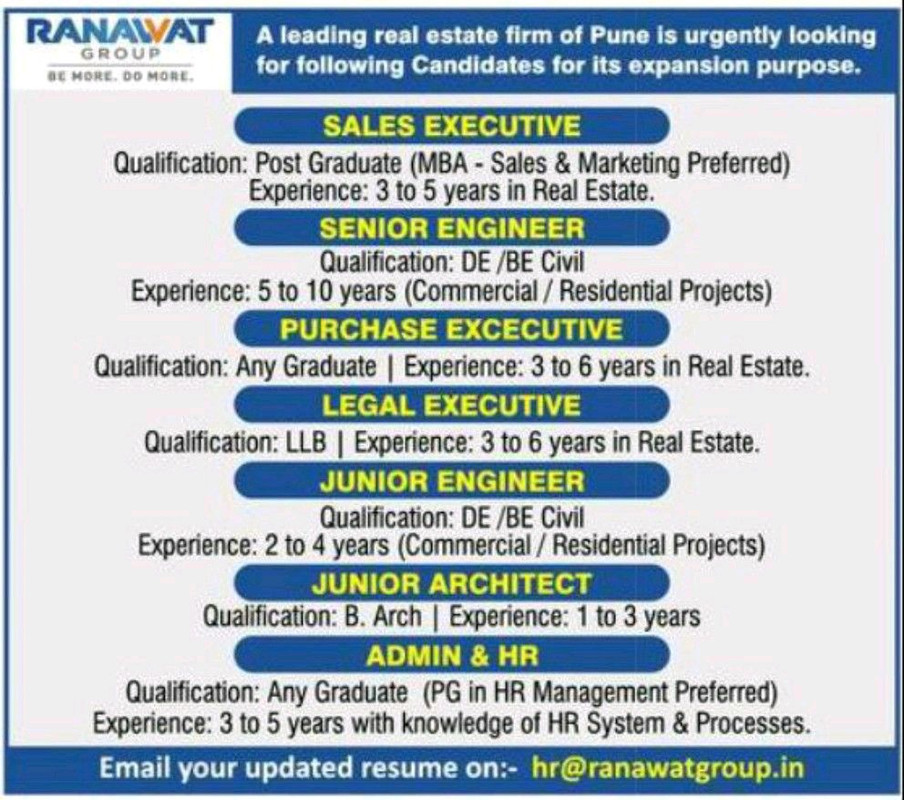 RANAWAT A leading real estate firm of Pune is urgently looking for following Candidates for its expansion purpose .